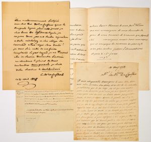 ─ L.S. « JUSSAC DE CONFLANS », 18 May 1738 (Louise-Françoise de JUSSAC, Marquise de CONFLANS : L.A.S. demandant une audience au cardinal de FLEURY, 1p in-4° et Madame de « JUSSAC D’ARMENTIÈRES » Paris 16 Juillet 1743 – qui est Diane Gabrielle de JUSSAC, la Mère du Maréchal d’ARMENTIÈRES, 3pp in-4°. Deux belles lettres.