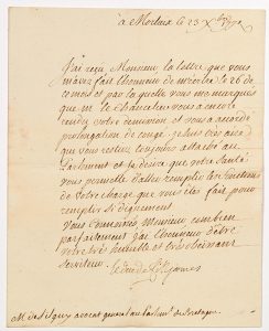 « … Vous me marquez que Mr le Chancelier vous a encore rendu votre démission et vous a accordé prolongation de congé. Je suis très aise que vous restiez toujours attaché au Parlement et je désire que votre santé vous permette d’aller remplir les fonctions de votre Charge que vous êtes fait pour remplir si dignement… » -