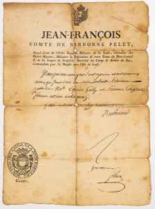 ILE DE CORSE. 1772. LAISSEZ-PASSER signée et à l’entête de Jean François NARBONNE, Comte de NARBONNE PELET (1725-1804) Maréchal des Camps et Armées du Roy, Commandant pour Sa Majesté l’Ile de CORSE. (En-tête à ses nom et titres).