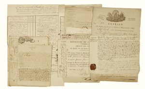 Ensemble de formats divers, savoir : Lettre réclamant ses titres de Seigneur de RONVAUX (1774) ; Acte de vente (1782), Acte de décès de son frère Émigré en terre étrangère (Prairial An 10 avec vignette) Copies d’États de services (1815 & 1816), Document de 1816 signé du Maréchal Duc de FELTRE (CLARKE) ; et divers –
