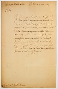 ─ Lettre signée « Le Duc de FITZ-JAMES » à Paris le 19 Mars 1764 – au Maréchal de BALINCOURT – « J’ai rendu compte au ROI, Monsieur, de l’affaire du sieur BROUZET dès le commencement, et je ne puis me dispenser d’attendre les ordres de sa Majesté pour la terminer mais je ne manquerai pas d’informer M. le Duc de CHOISEUL de ce que vous me faites l’honneur de me marquer… » 1p in-folio.