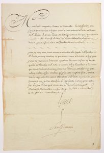 Lettre d’avis de la réception de Louis Augustin DASTRUC DE VINTIMILLE à la dignité de Chevalier de SAINT LOUIS. Il devra prêter le Serment devant le Maréchal duc de BIRON Colonel du régiment des Gardes Françaises, et recevoir de lui l’accolade et la Croix qu’il doit vous dorénavant porter sur l’estomac, attachée d’un petit ruban couleur de feu. Écrit de VERSAILLES (Château de) le 23 Novembre 1776. 1p grand in-folio.