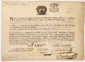 PARIS. 1780. CORPORATIONS – Pièce signée des Gardes & Adjoints du Corps des Marchands DRAPIERS-MERCIERS, GROSSIERS, JOUAILLIERS de PARIS (A. Caron, Doucet, Courtier, Boucheron, Lefebvre Desnöuettes) -