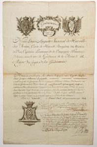 Pièce signée Louis Auguste JUVENAL DE HARVILLE DES URSINS, Comte de HARVILLE, Brigadier des Armées du Roi et du Maréchal et Député Charles de La Croix de CASTRIES.