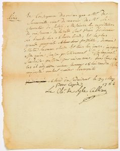 (MARINE.) Joseph Ignace de LYLE, Seigneur de CALLIAN, ROQUEBRUNE, Chef d’Escadre dans la Marine. (1713-1794) Lettre signée « Le Chevalier de LYLE CALLIAN », pour copie d’un ordre fait à bord du vaisseau LE SÉDUISANT le 29 May 1784 –