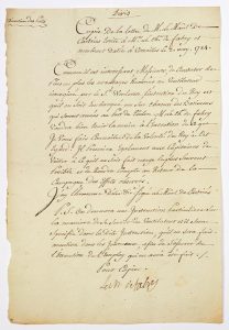 Pièce signée Le Chevalier de FABRY, pour copie de la Lettre du Maréchal de CASTRIES à lui adressée et à MALOUET, datée de Versailles le 2 May 1784.