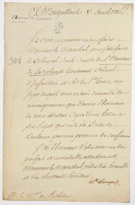 Gabriel de TALLEYRAND-PÉRIGORD (1726-1795) Comte de Grignols et Baron de Mareuil. Comte de Périgord à partir de 1768. Lieutenant-Général. Dernier Gouverneur de Picardie en 1769. Lettre signée « Le Comte de PÉRIGORD », au Maréchal de...