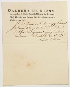Lettre signée « d’ALBERT DE RIONS, Commandeur de l’Ordre de St LOUIS, Chef d’escadre des Armées Navales, Commandant la Marine au Port de TOULON » (Son en-tête impr.) - TOULON (83) 22 Décembre 1787 - 1/2p in-4° -