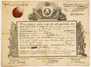 Vaudreuil » Maréchal des Camps des Armées du Roi, sur un Congé militaire du Régiment des CUIRASSIERS DU ROY. Cavalerie. Congé absolu pour un brigadier du Régiment natif d’ECTOT (27). Fait à SAINT-JEAN-D’ANGÉLY (17) le 15 Mars 1789. Brevet gravée rempli à l’encre (21 x 29) –