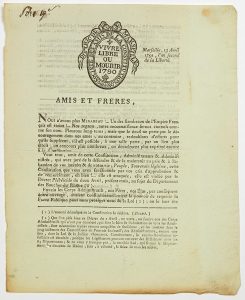 « MARSEILLE 13 avril 1791. Amis et Frères. Nous n’avons plus MIRABEAU !... Un des flambeaux de l’empire Français s’est éteint !... Ils demandent à annuler le Décret du 2 Avril 1791 qui frappent le Département des Bouches-du-Rhône. Vignette « District de Marseille, Société des amis de la Constitution. Vivre libre ou mourir 1790. » -