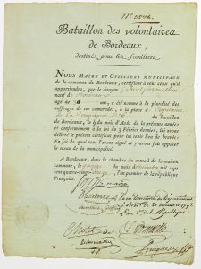GIRONDE - “BATAILLON DES VOLONTAIRES de BORDEAUX destinés pour les frontières.” (En-tête) - Certificat pour tenir lieu de Brevet de Capitaine de la Cie N°6 ; pour Gabriel FORT ROUSSEAU natif de Bordeaux, nommé à la pluralité des suffrages...