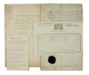 ─ Commission de BRIGADIER DE LA MARECHAUSSÉE en faveur de Humbert Joseph GAUX, Fait à VALENCIENNES (Nord occupé) le 3 décembre 1793, à condition de prêter le serment de fidélité à Sa Majesté l’Empereur et Roi (d’Autriche), pour l’administration provisoire du Pays conquis. 1p in-folio. Cachet de cire