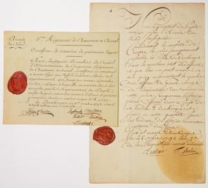 ─ DUNKERQUE (59) 1er Octobre 1793. P.S. du Conseil du 5e Régiment de CHASSEURS À CHEVAL de l’Armée du NORD. Attestons n’avoir payé au Chef d’Escadron SAUËR, ses appointements que jusqu’au 30 Septembre Inclus, époque à laquelle sa retraite lui a été accordée par les Représentants du Peuple. page in-8° oblong –
