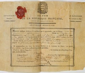 CERTIFICAT D’OFFICIER dans le 6° Bataillon de la formation de DOUÉ, Fait à TOURS (37) An 2 (1794). Cachet cire – Vignette. Vélin gravé (26 x 34).