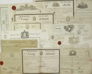 ─ Congés et certificats militaires de la Convention Nationale au Consulat. Certains sont signés de Généraux de la Révolution et de l’Empire. Belles vignettes.
