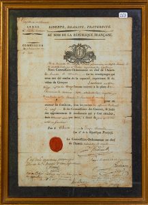 Vignette « République Française et Cachet. Fait à WAREM (Waremme en Belgique) le 12 Thermidor An 2 (30 Juillet 1794) – Document in-folio, encadré (44 x 32) –