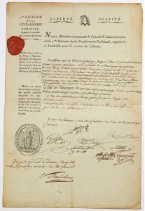 Certificat pour le citoyen CLAUSE Adjudant Lieutenant, avant la guerre Gendarme à la Résidence de Strasbourg (Bas-Rhin), bon officier, qui a fait les Campagnes de 1792 à 1795 -