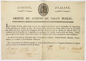 détachées, qui sont nécessaire à la subsistance de leur famille. Signé (impr.) Cambacérès, Carnot, Dubois-Crancé, Marque, Pellé, Prieur (de la Marne)… -