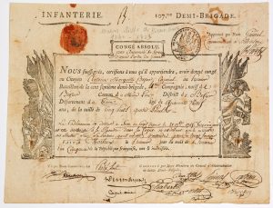 MORLAIX (Finistère) 1er Brumaire An 5 (1796). Pièce signée Olivier HARTY, Général Commandant à MORLAIX (Irlande 1746 – 1823) et du Conseil de la 107e Demi-Brigade d’Infanterie – Congé absolu par ancienneté de service au citoyen Antoine...