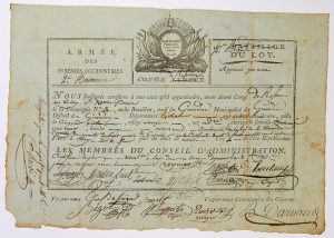 Au verso; Certificat de blessure par balle, fait à BAYONNE, le 15 Vend. an 4 – Pièce signée des Officiers de Santé en Chef de l’Hôpital militaire de BAYONNE –