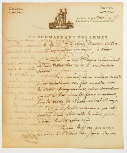 “Comme la paix que nous apprenons à l’instant être signée depuis le 26 dudit mois, mettra peut-être ce Général dans le cas de recevoir de nouveaux ordres.. en attendant je vous invite à communiquer au Chef de Division PERRÉE qui commande la Division stationnée dans le nord de l’Adriatique, ma lettre qui renferme l’avis que les Conservateurs de Santé m’ont donné à l’égard des Bâtiments partants des ports contaminés, et copie de la dépêche du Ministre de la Marine concernant la répartition des officiers dans les grands ports...” –