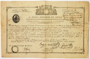 Congé absolu pour cause d’infirmité, au vu des Officiers de Santé de l’Hôpital de CHERBOURG, délivré au Fusilier COURTIAS, natif de TOURNON (07).