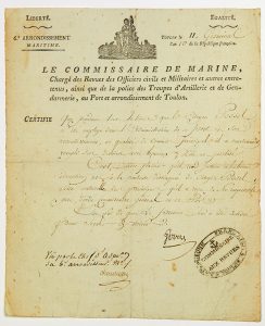 Certificat pour un Commis Principal le sieur POSSEL qui a constamment rempli ses devoirs avec honneur, zèle et probité - Cachet “Commissaire aux revues. Rép. Fr. - TOULON.” –
