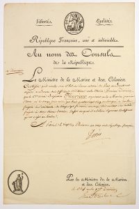 (MARINE) - DECRÈS (Denis, Comte puis Duc), Château-Vilain (Haute-Marne) 1761-1820 - Marin et Ministre - « AU NOM DES CONSULS de la République » (En-tête impr., vignette « Marine et Colonies. ») - L.S. en tant que Ministre de la Marine et des...