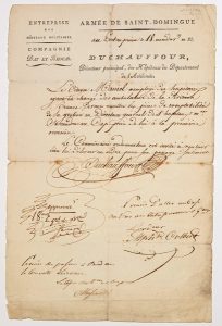 « ARMÉE DE SAINT DOMINGUE. » 1803. Pièce signée DUCHAUFFOUR Directeur principal des Hôpitaux du Département de l’ARTIBONITE. (En-tête impr.) & du Général Jean SARRAZIN. Au Port au Prince le 18 Messidor An 9 (07/07/1803) –