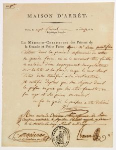 Certificat pour un détenu hors d’état d’être transféré. “..Je certifie de plus que son séjour dans la prison ne peut que lui être funeste, vu son âge et ses peines morales.” -