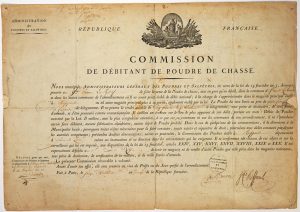 SARTHE. 1804. POUDRERIE DE RIPAULT (INDRE-ET-LOIRE.) “Commission de débitant de POUDRE DE CHASSE.” Pièce imprimée avec mentions manuscrites (33 x 46), belle vignette allégorique - Autorisation de vendre de la poudre de chasse dans la commune...
