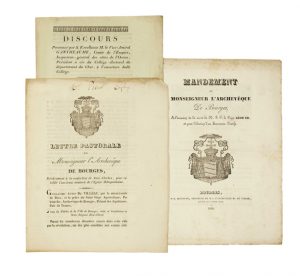 ─ « Lettre pastorale de Mgr l’Archevêque de BOURGES relativement à la confection de trois CLOCHES, pour rétablir l’ancienne sonnerie de l’Église Métropolitaine. » 26 déc. 1827 – Impr. à Bourges, chez Manceron ; 4pp in-4°