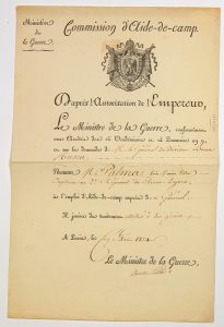 général de Division Baron RUSCA, par autorisation de l’Empereur, délivré à M. PALMA, Capitaine au 2e Régiment des Chevau-Légers – Vignette à l’aigle au manteau – 1p in-folio –