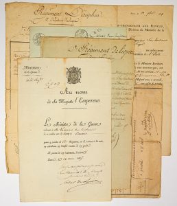 ─ Blessé au blocus de Landau, à Essling…) ; 2 Certificats fait au 3e Régiment de Ligne, devenu Dauphin, autorisé à se retirer, Douai 1er Sept. 1814 ;