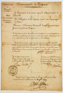 HÉRAULT. 1829. Commission de PIQUEUR de LOUVETERIE pour Mr BENEZECH Joseph propriétaire foncier à PEZENAS - P.S. du Lieutenant de Louveterie du Départ. de l’Hérault, du Préfet de l’Hérault, du Chef d’Escadron de Gendarmerie Commandant...