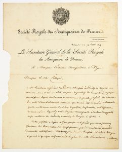 (FOUILLES ROMAINES) - BARBIE DE BOCAGE (Alexandre-Frédéric) 1798-1834 - Géographe comme son père – Lettre A.S. comme “Le Secrétaire Général de la Société Royale des ANTIQUAIRES de France.” (En-tête imp., vignette) - à Mr BAUDOT...