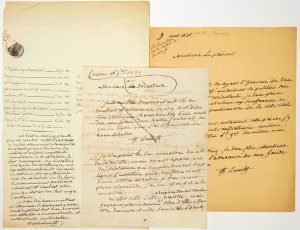 ─ 3) L.A.S. brouillon de lettre à un rédacteur “Je n’ai point le 1er mémoire de M. de LA FAYETTE... relative à l’insertion d’une lettre “adressée à feu mon frère Alexandre, j’ai du chercher à la connaitre...” - 2pp in-4° - Paris le 16 Janvier 1839 - les trois :