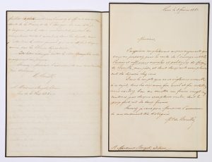 “Je consens que le prix soit fixé à 6 francs par volume, à ce que vous soyez seul chargé de la vente de cette publication sur les titre et couverture de laquelle votre nom seul figurera. Je vous ferai remettre, sur les mille exemplaires dont se composeront l’Édition, quatre cents exemplaires brochés et cinq cents en feuilles...” - 2pp in-8° -