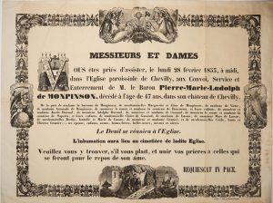 LOIRET. Château de CHEVILLY. Baron de MONPINSON. 1853. Affiche mortuaire du 28 Février 1853, concernant l’enterrement dans l’Église de CHEVILLY du Baron Pierre Marie Ludolph de MONPINSON, décédé dans son Château de CHEVILLY (Loiret)....