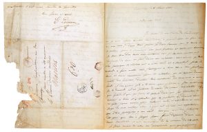 (INDE FRANÇAISE) – LETTRE DE PRISON de PONDICHERY, le 6 août 1854 – L.A.S. de E. LEROUX, à son frère Médecin à NANTES - 3pp in-4° avec adresse et Marq. Post. (déchirure avec quelques manques en bouts de ligne à la 3ème page) –