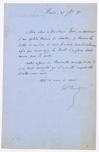 « Mon cher Monsieur YVER, en arrivant d’une petite tournée de chasse, je trouve la lettre ci incluse et vous l’envoie immédiatement afin que vous ayez la bonté d’y faire droit comme par la passé. Votre affaire de Mormette marche-t-elle ? J’ai tant travaillé qu’il m’a été impossible d’aller vous voir… » -