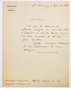 (RUSSIE. 1858) DUC De MONTEBELLO (Napoléon Auguste LANNES) Pair de France (1815) , Ministre 1839 et 1847 et Ambassadeur, fils du Maréchal LANNES (1801-1874) Lettre signée « Duc de MONTEBELLO » Ambassadeur à ST PETERBOURG (Russie) le 9 Septembre...