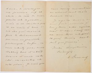 « Monsieur, Vous pouvez prendre mon manuscrit chez mon concierge. J’ai retrouvé votre pièce et je l’ai lu. Il y a dedans beaucoup de qualités. Je ne la crois pas possible dans l’état où elle se trouve. Je vous crois plus porté à l’esprit et à la grâce qu’au drame et au tragique. Le situation du révolver à la fin est impossible. C’est à la fois trop long et pas assez posé. Cependant le dialogue est souvent vif et alerte. Le rôle de Marguerite est agréable, mais ne conclut pas et ne même à rien. C’est elle qui devrait faire le dénouement par une ingéniosité quelconque. Enfin ne vous rebutez pas, mais établissez bien d’abord avant d’écrire votre idée, vos caractères et votre place. Je crois que vous écrivez au contraire en allant tout droit devant vous. Je regrette de vous avoir fait attendre si longtemps cette réponse mais si vous saviez comme mon temps est pris et puis vaut mieux tard que jamais. » -