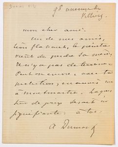Alexandre DUMAS dit DUMAS Fils, Écrivain (Paris 1824-1895). Lettre autographe signée « A. DUMAS », 98 Avenue de Villiers, 1p in-12° -