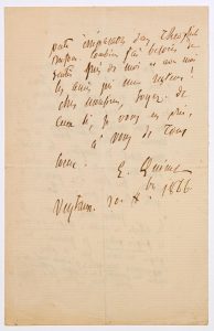 « Oui, Certainement cher monsieur et ami, je suis très content et touché de ce que vous appelez le règlement de ce petit compte. Je reconnais là une vraie amitié… Je me suis servi des paroles de votre lettre, à eu près textuellement. Quant aux épreuves, je les attends en double. Papier ordinaire et papier pelure. Je garderai le papier ordinaire près de plume, & épargnera mes yeux. Je n’aurais aussi qu’a reporter mes corrections sur le papier pelure. Hélas oui, j’ai fais une faute irréparable dans Théophile DUFOUR. Combien j’ai besoin de sentir près de moi et avec moi les amis qui me restent ! Cher Monsieur, Soyez de ceux ci, je vous en prie, à vous de tout cœur. E. QUINET. »