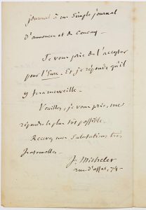Jules MICHELET, Historien, Professeur au Collège de France (1838 - Paris 1798 – 1874), Il publie une monumentale Histoire de France (1833-1846) & Histoire de la Révolution française (1847-1853) – Lettre A.S. Jules MICHELET, 74 Rue d’Assas...