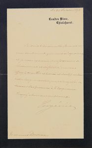 EUGÉNIE, IMPÉRATRICE (Eugenia Maria de Montijo de Guzman) Grenade 1826 - Madrid 1920) - Lettre signée de son exil en Angleterre, peu après la mort de l’Empereur - Camden Place, Chislehurt 20 février 1873 - 1p in-8° bordée de noir - à M....