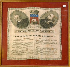 « Souvenir des Élections de 1877. Union de tous les Groupes Républicains. » Portraits en médaillon de Louis Adolphe THIERS et de Léon GAMBETTA, au centre le Blason de la Ville de PARIS ; Dans les signataires des membres des bureaux de gauches, il y a Bertauld, Arago, Victor Hugo, Paul de Rémusat, Ch. Flocquet, Louis Blanc, etc… -