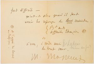 “Oui, cher ami, je transmettrai la note avec mes paroles les plus éloquentes. Mais lorsqu’il y a un ministre tout est déjà fort difficile. Qu’est-ce alors quant il faut avoir les réponses de deux ministres (Beaux-Arts, Affaires Étrangères) plus l’appui du Consul de Belgique. À vous mon ami, de tout coeur.”
