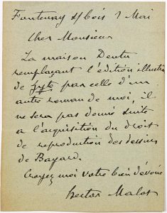 “Cher Monsieur. La Maison DENTU remplaçant l’édition illustrée de Zyte par celle d’un autre roman de moi, il ne sera pas donné suite à l’acquisition du droit de reproduction des dessins de BAYARD…”